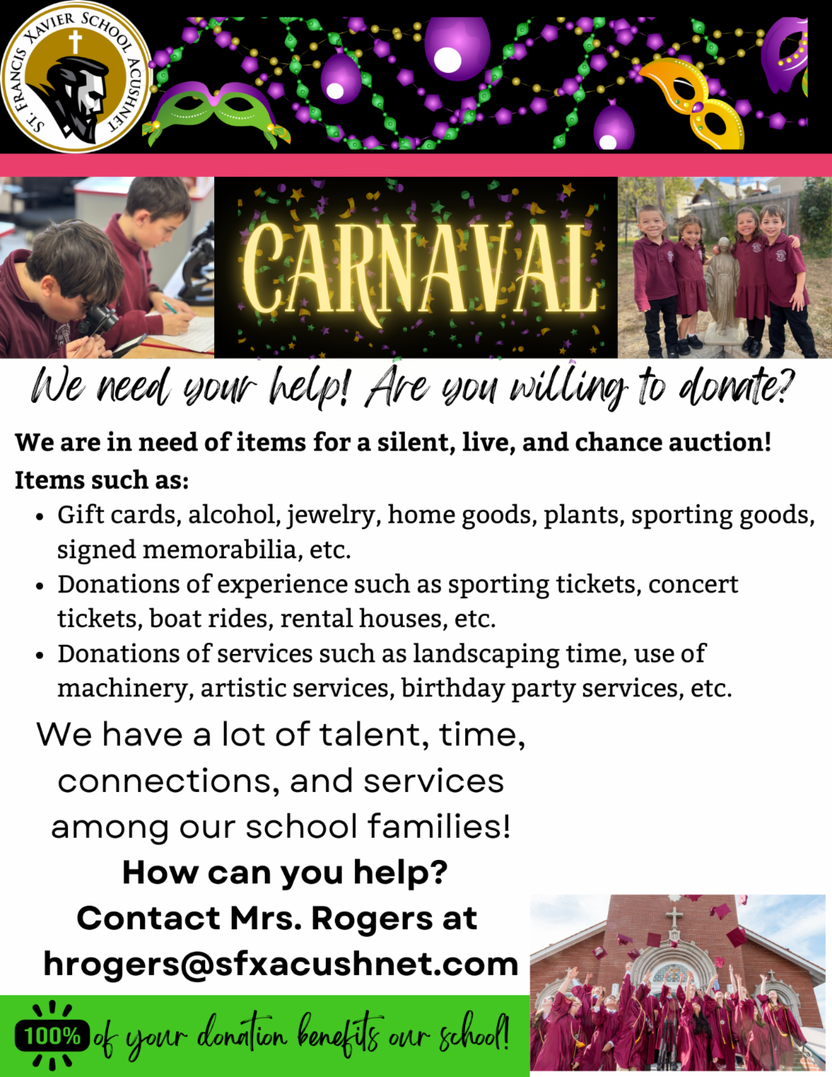 Please contact Mrs. Haley Rogers for more info on Benefit Banquet Sponsorship Opportunities: hrogers@sfxacushnet.com